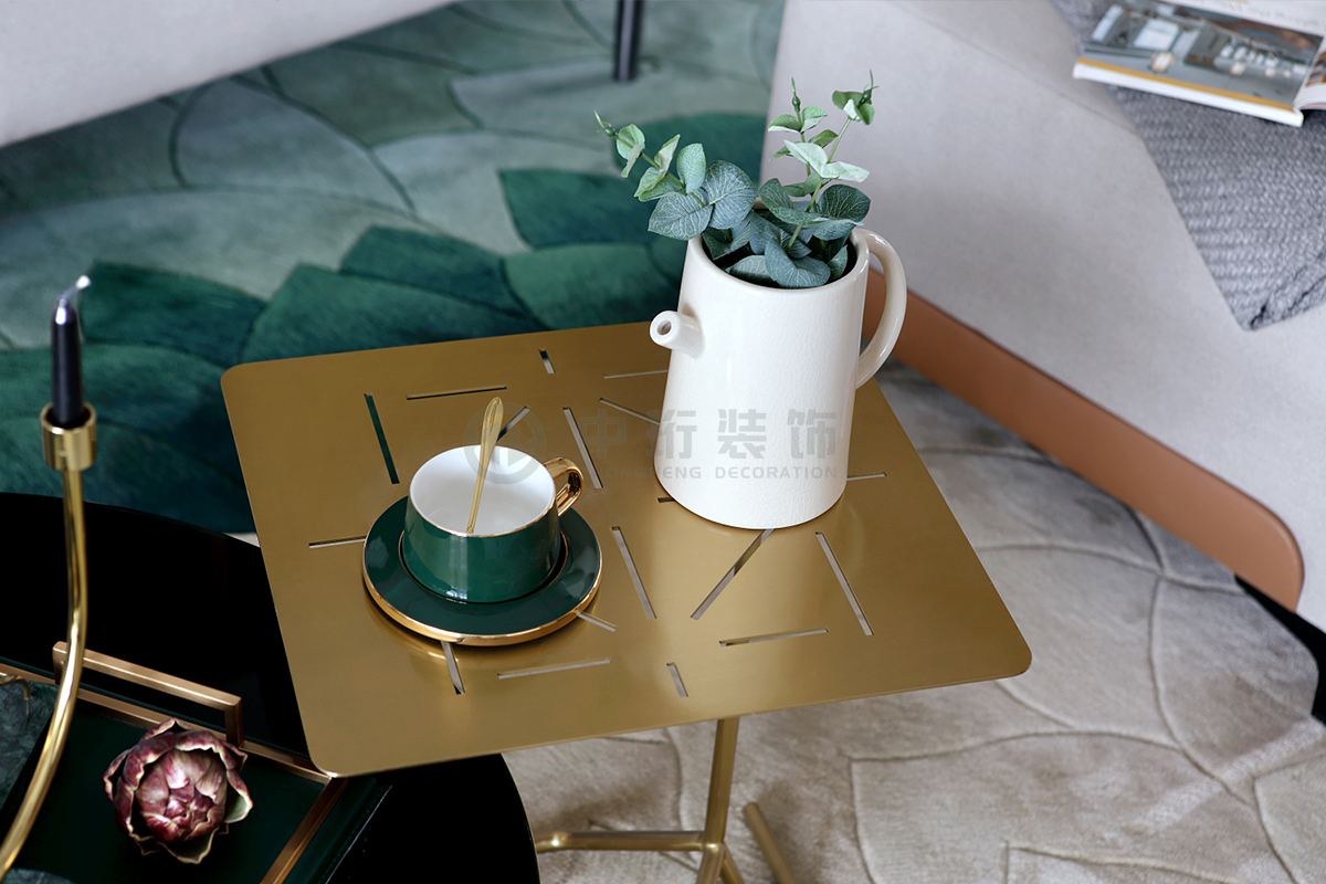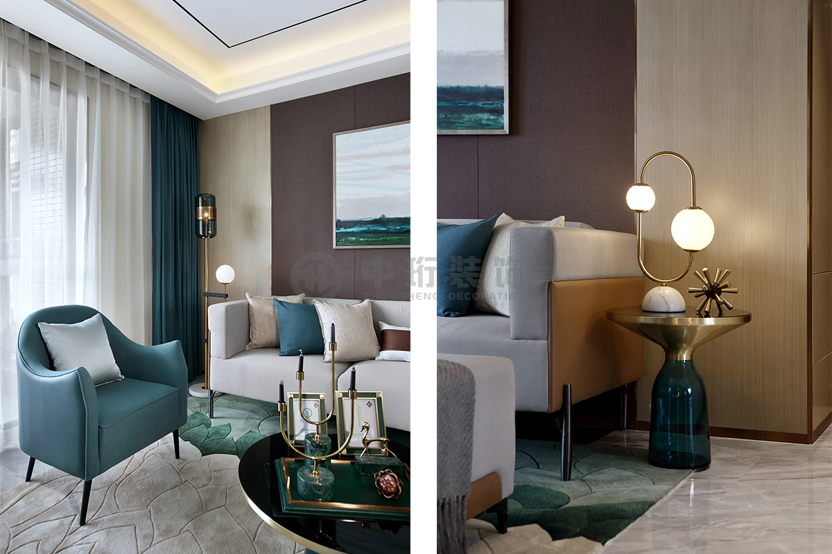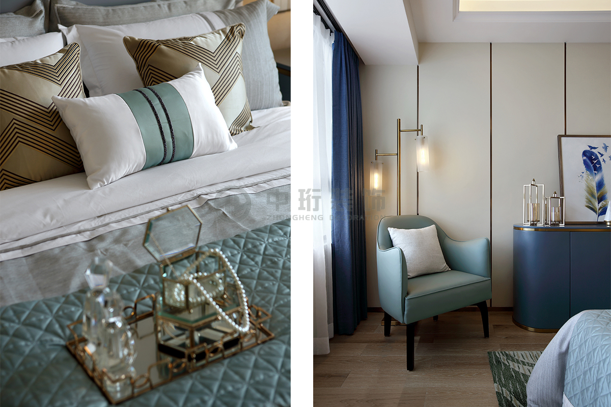 主要材料:天然尼斯木、超纖地毯、玫瑰金不銹鋼、茶鏡玻璃、藍金沙大理石、麻布硬包