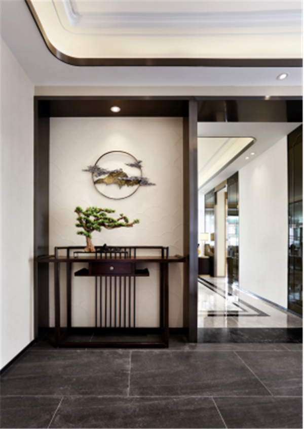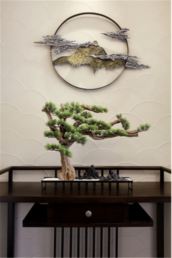 玄關(guān)遮擋來(lái)訪者的部分視線,卻又能從墻壁鏡面窺見一斑,既避免入室即觀全貌的尷尬,又將勾起與生俱來(lái)的好奇心。文人喜愛(ài)山水、花鳥等富有生趣之物,以物寄情,托物傳情,蔥郁的迎客松搭配高山行云,煙火人生亦能清逸優(yōu)雅。