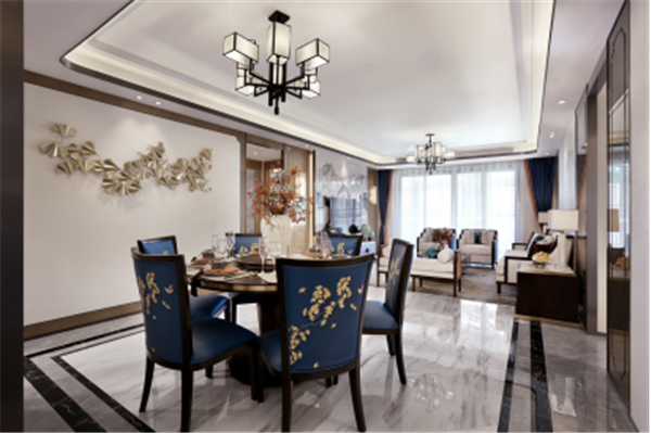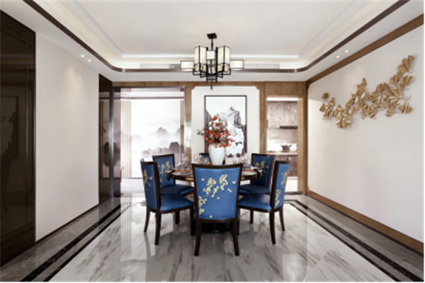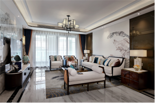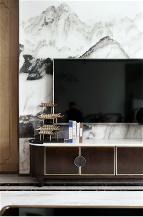 玄關(guān)至客廳,由中式山水水墨畫來(lái)進(jìn)行裝修設(shè)計(jì)過(guò)渡,遠(yuǎn)山近水,漁翁行船,滿載而歸,文人之氣在山水工筆畫之中暈染開來(lái)。