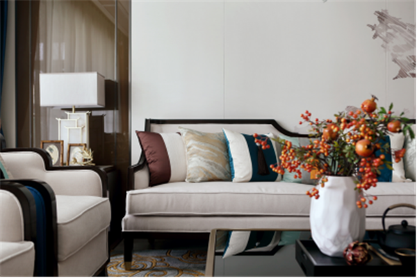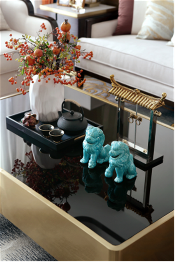 于細(xì)處,將中式園林中“移步換景”運(yùn)用到極致,空間層次豐富,換個(gè)角度又是另一番風(fēng)景。皮革沙發(fā)搭配影木扶手,時(shí)尚與古樸的之間,是對(duì)生活的品質(zhì)追求。