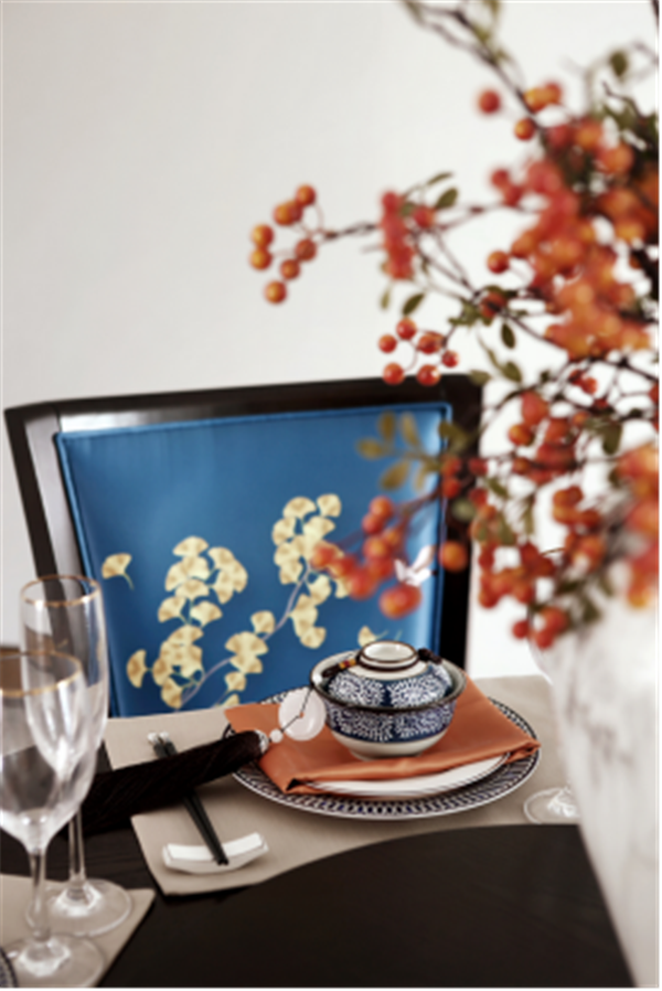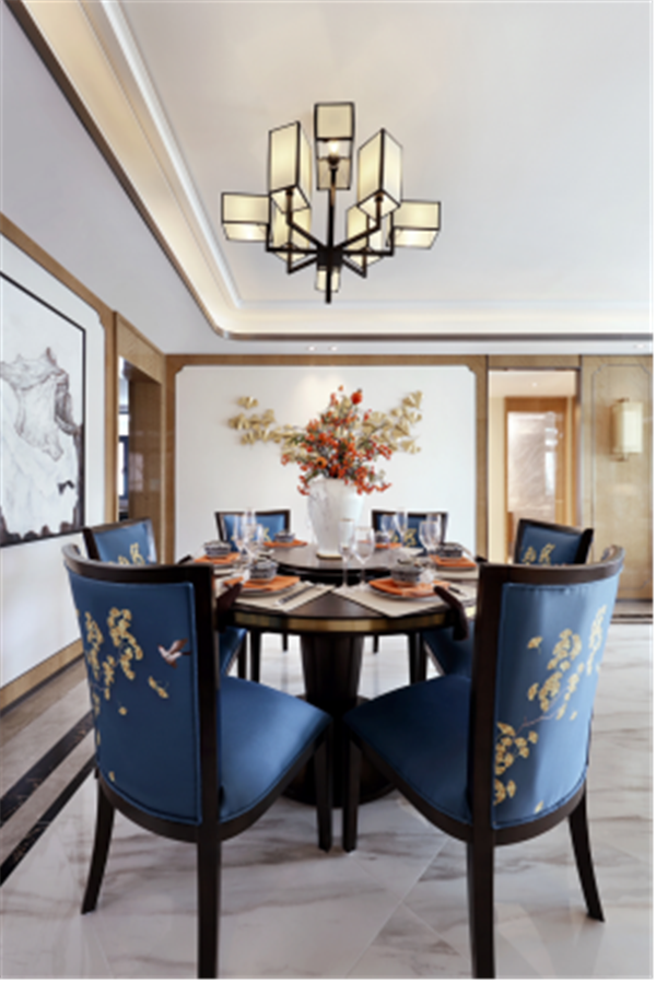 銀杏是健康和諧的象征,石榴蘊(yùn)含希望、多子多福的美好寓意,方正燈飾亦有正直純厚之意,空間內(nèi)的每個(gè)物件都是精心挑選,是美好生活的載體。
