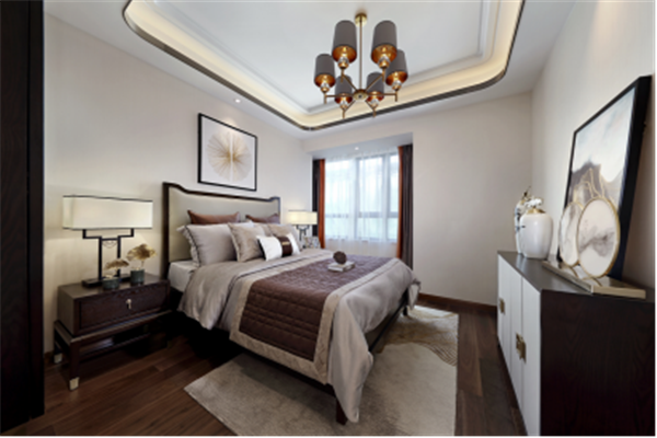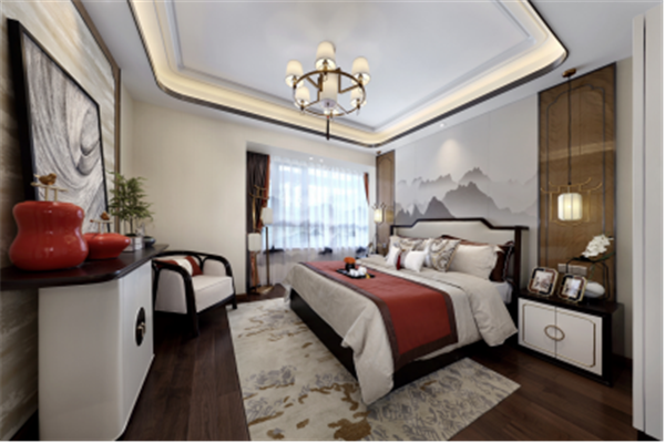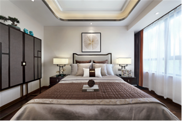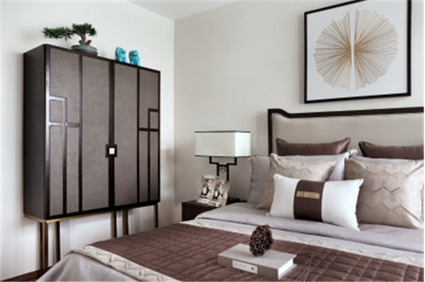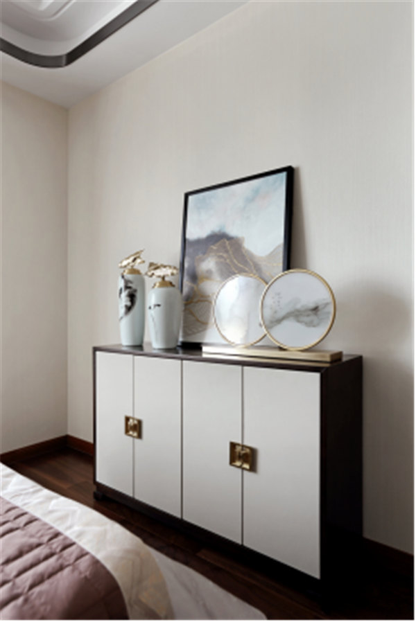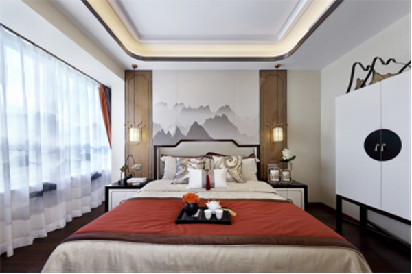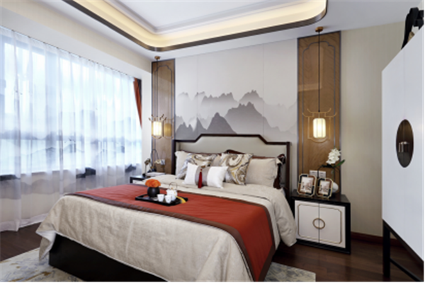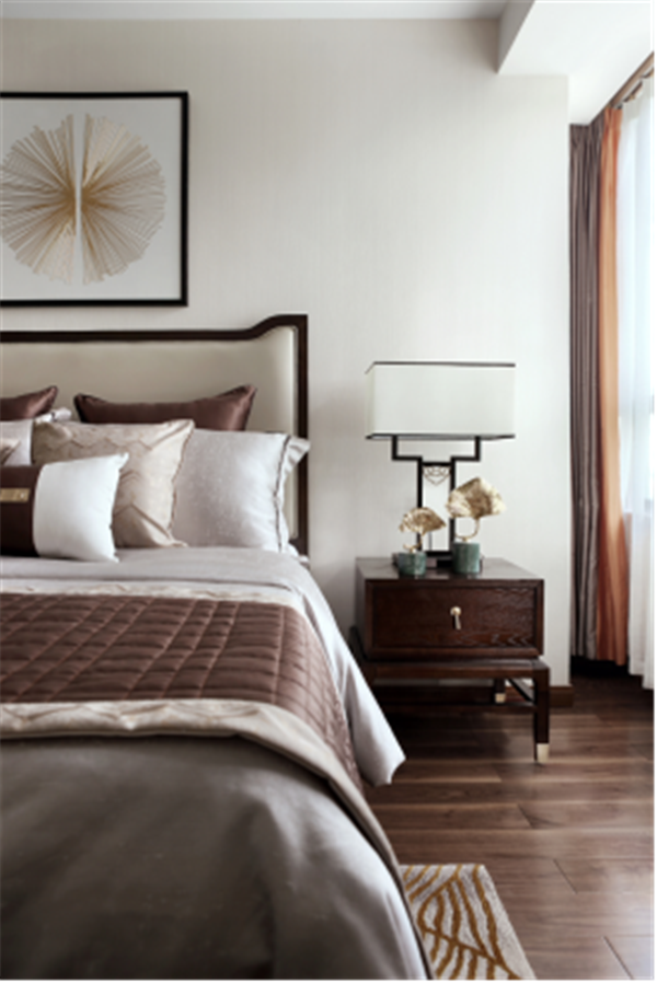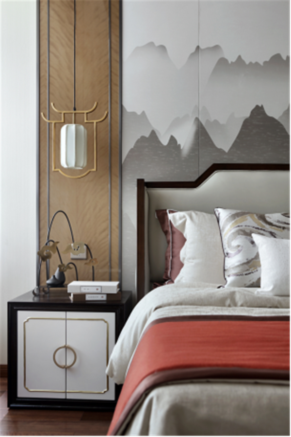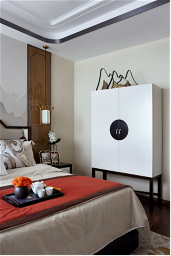 除卻傳統(tǒng)中式的濃墨重彩,主臥內(nèi)又見山水,素色鋪底,輔以熱情橙作為點(diǎn)綴,清逸雅致之間,不乏生動(dòng)活潑之氣。