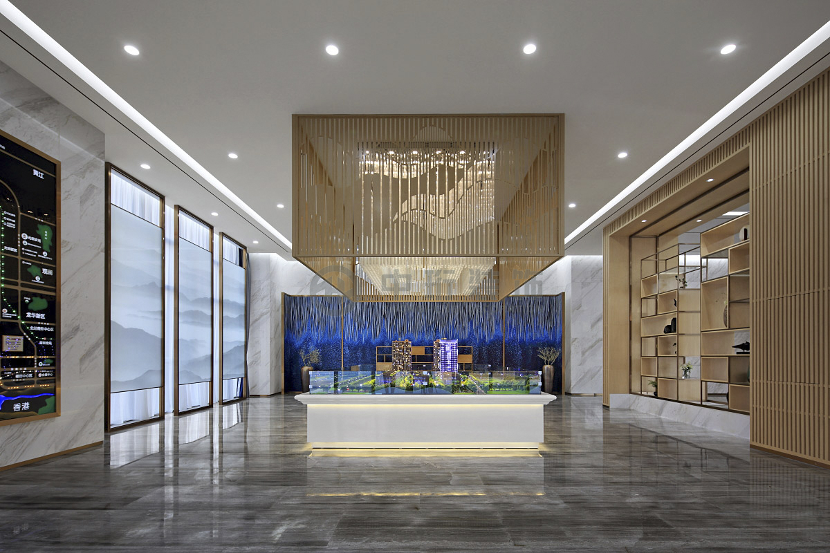 Δ 沙盤區(qū)的設(shè)計(jì)通過大氣的水晶吊燈、格柵雕欄、藝術(shù)掛畫等富有晶透、雅致的材質(zhì)來增加空間靈性,突出新中式的特色。