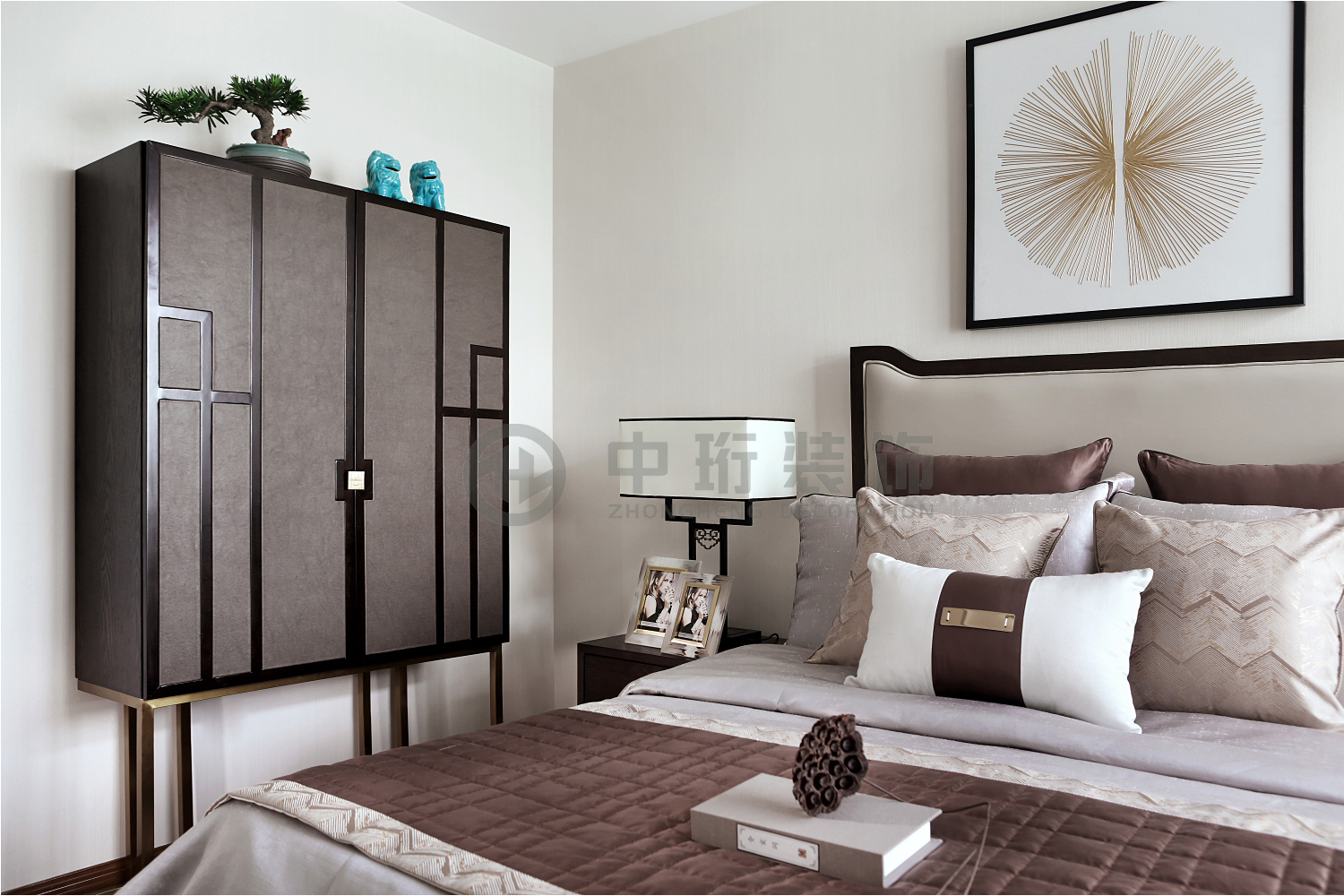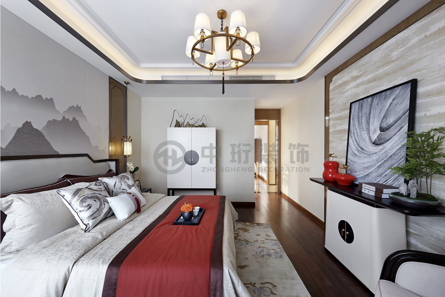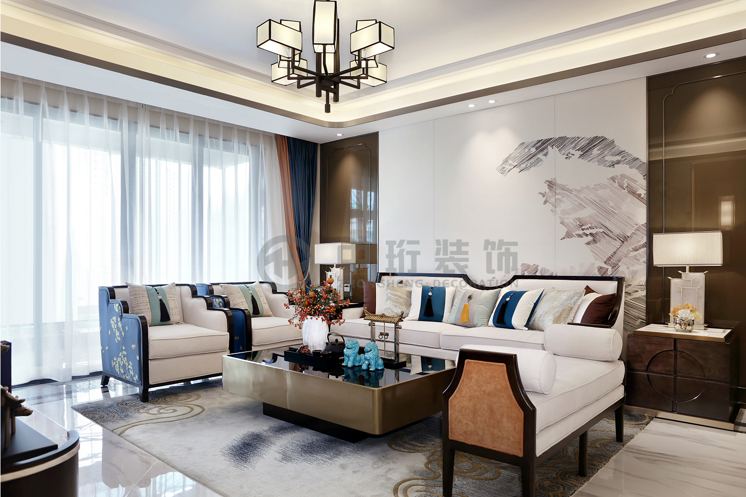 本案為新中式風(fēng)格,以寶石藍(lán)為其主色調(diào),用色彩飽滿的裝飾加以點(diǎn)綴,將文人之氣寄托于山水工筆畫之中,使其整體端莊優(yōu)雅而不失活潑之氣。