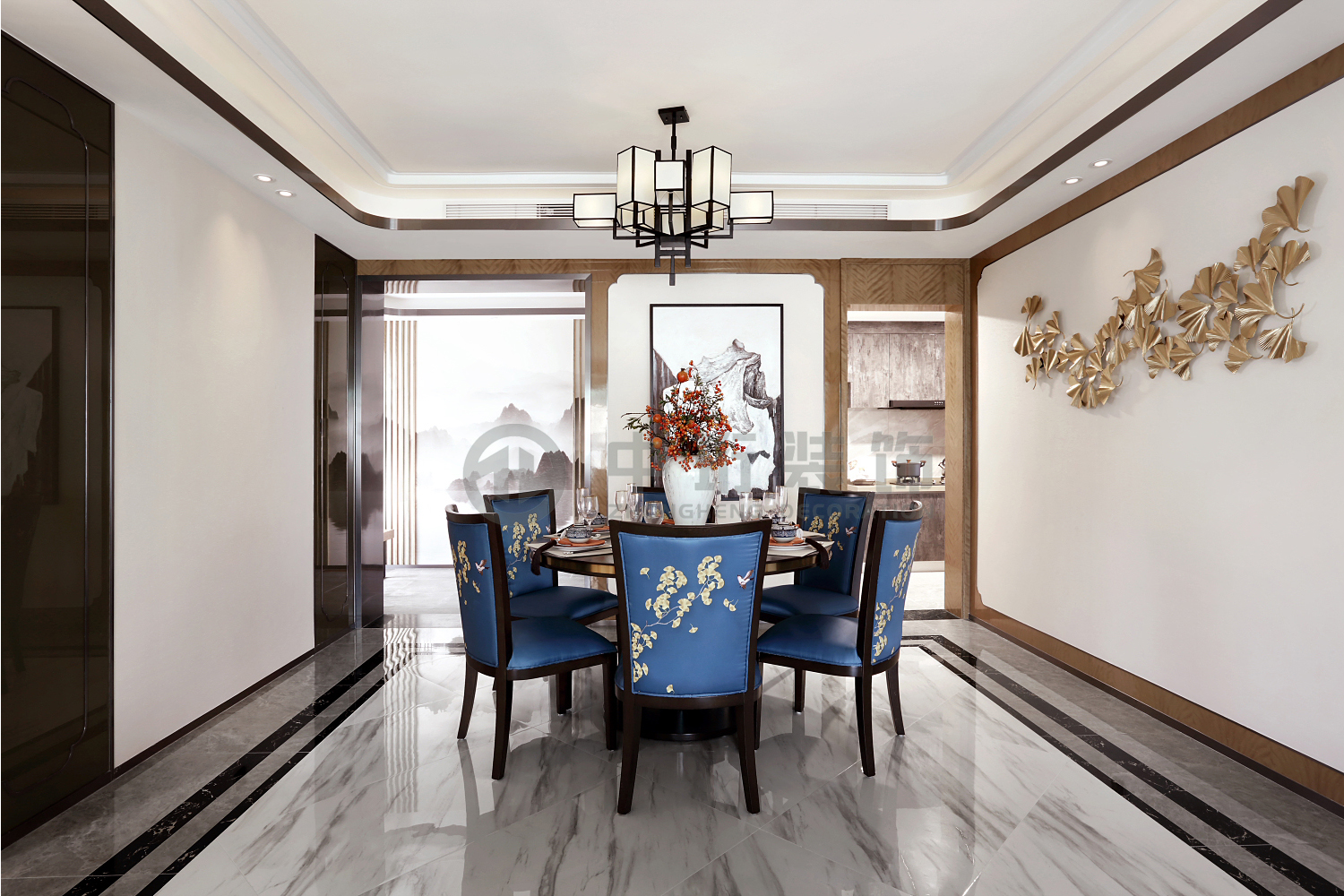 Δ 餐廳延續(xù)古典與現(xiàn)代相結(jié)合的特點(diǎn),黛藍(lán)色的布藝與明黃銀杏刺繡相融合,和銀杏墻飾遙相呼應(yīng),盡顯自然之趣。