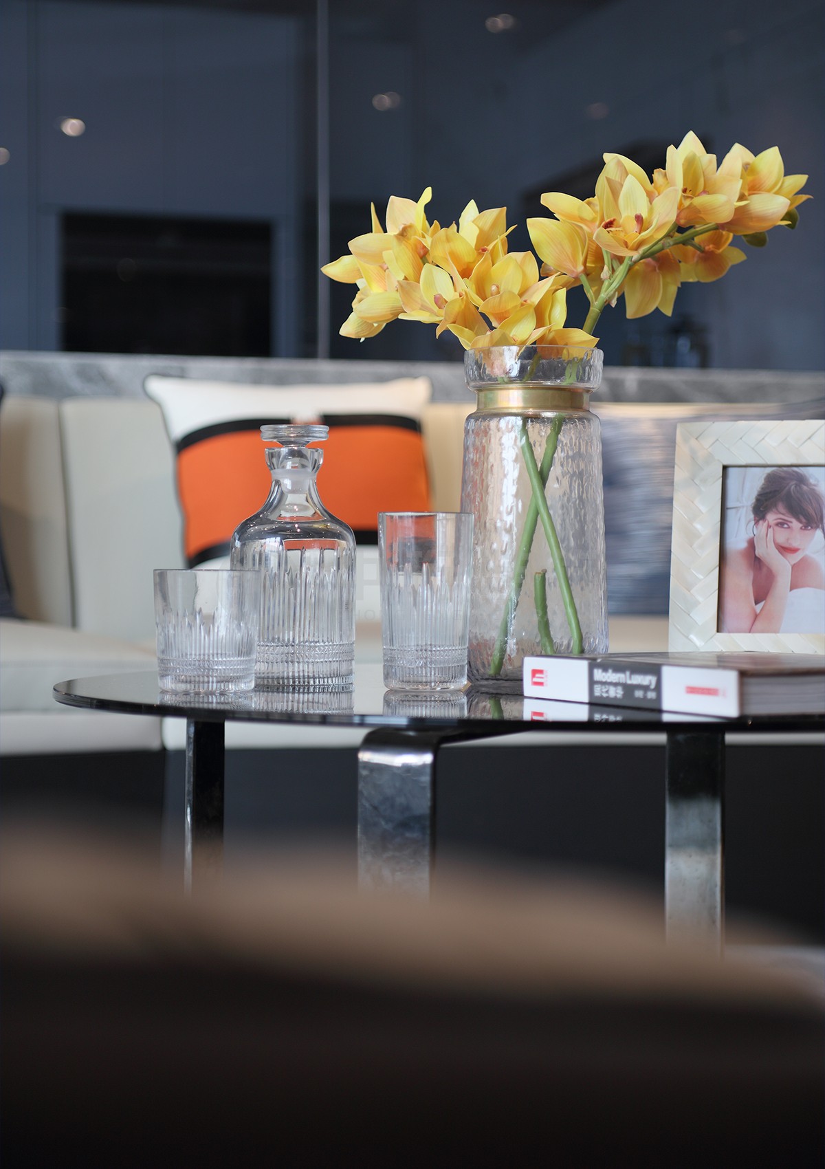 △ 空間在暖黃色調(diào)的烘托下,使家的溫暖氣息更加濃厚,大面積的落地窗連接室外露臺,將上海的城市風(fēng)光攬入眼底。